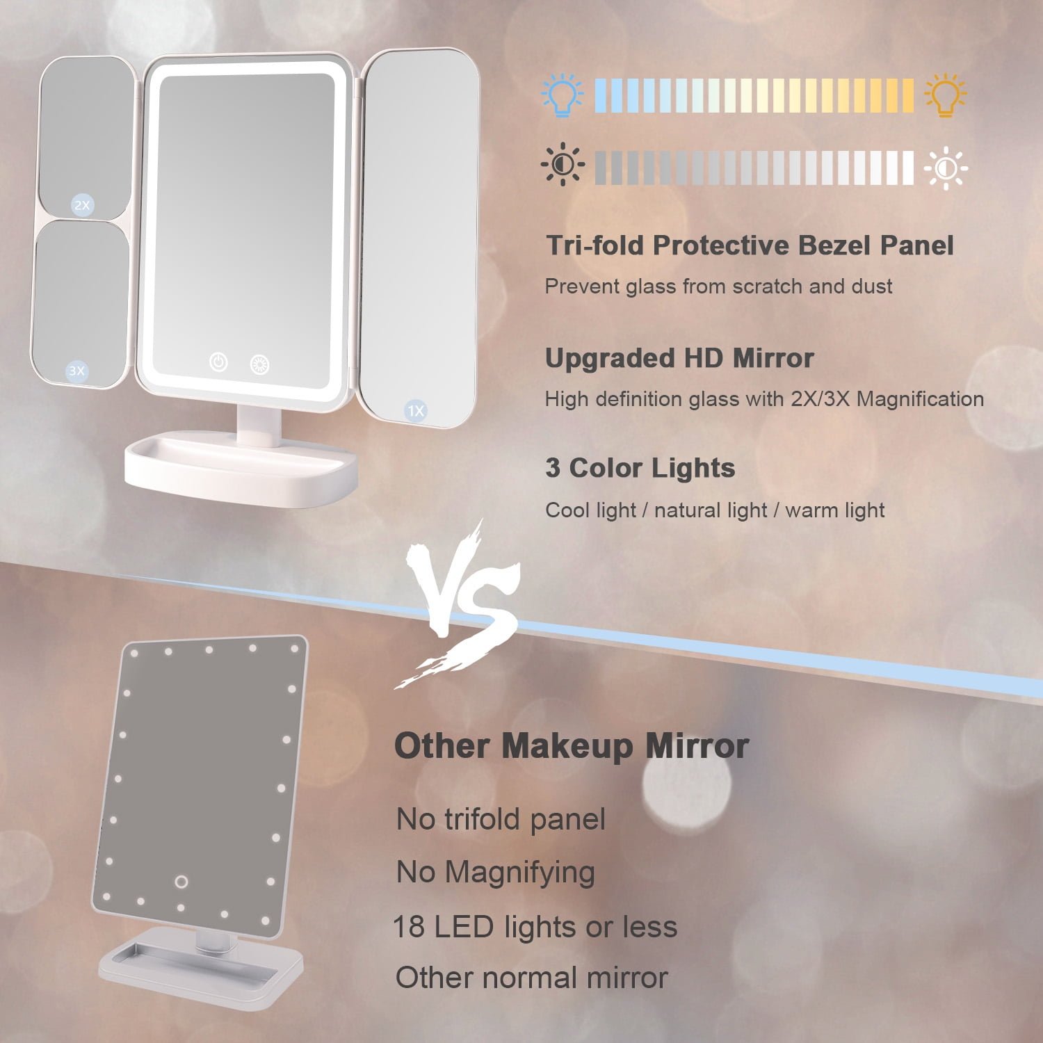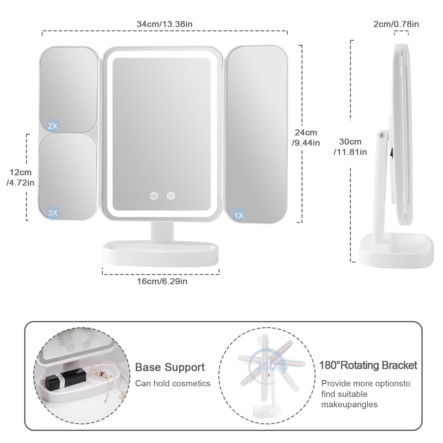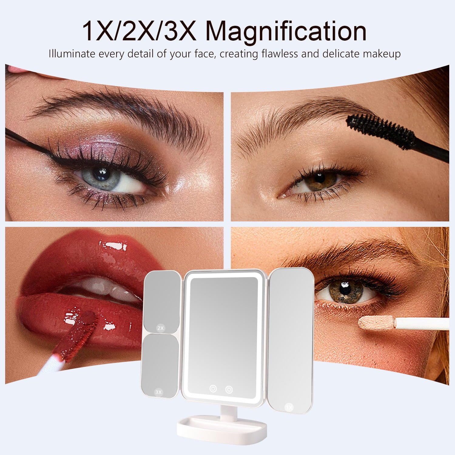 The tri-fold design provides multiple viewing angles and folds compactly for easy storage or travel. The adjustable brightness ensures you have ideal lighting whether you’re in a dim hotel room or a bright dressing area. The included 1× mirror for overall view, 2× mirror for medium detail, and 3× magnification mirror for precise close-up work makes this mirror perfect for beauty beginners and pros alike.
