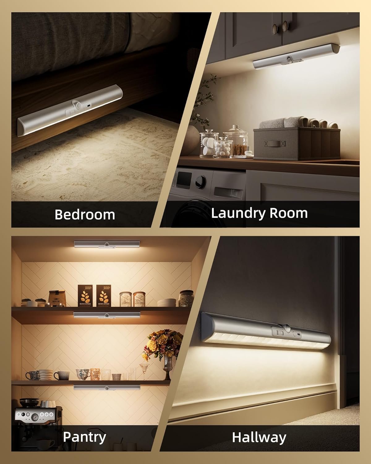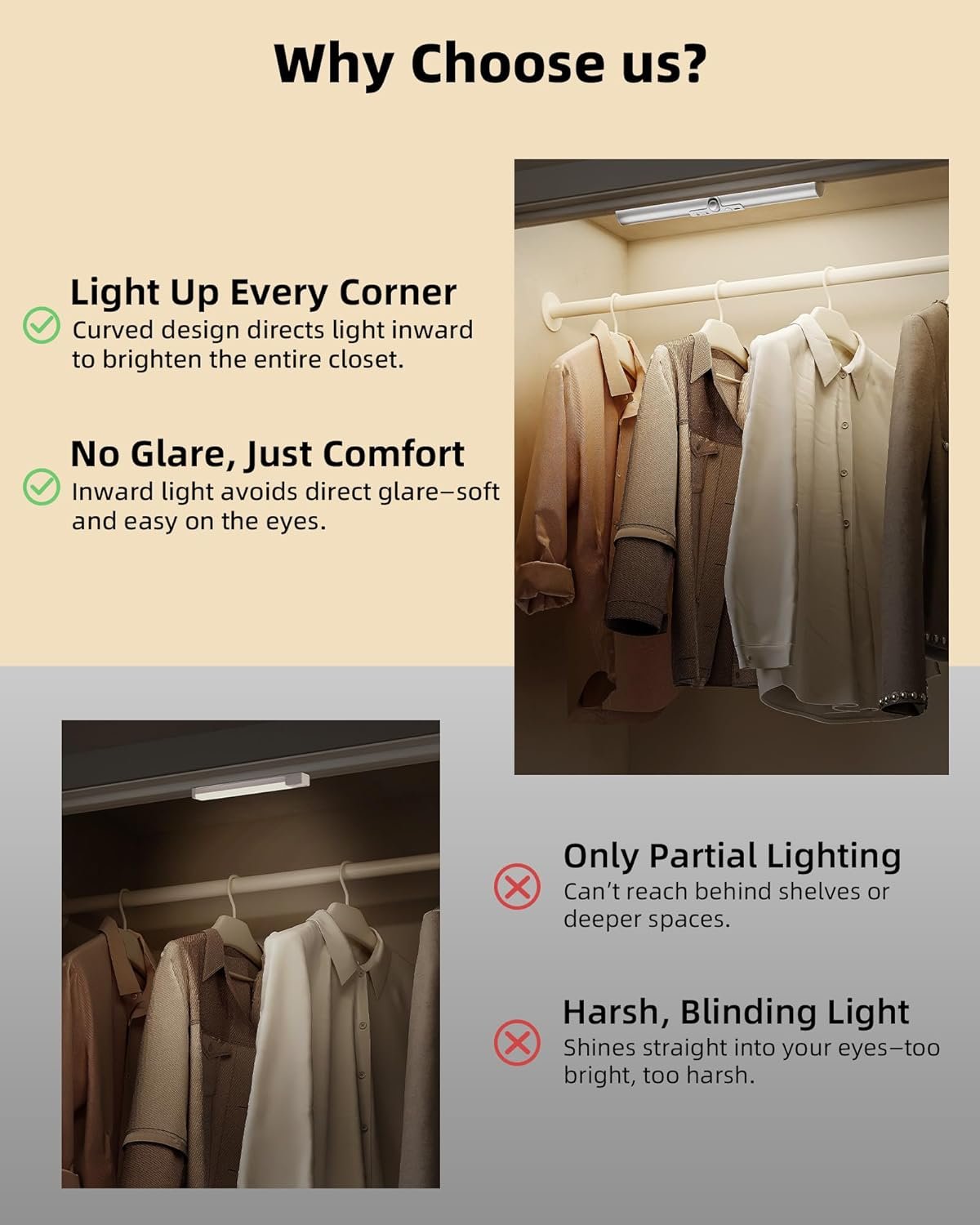 Curved Design for No-Glare Full Coverage: Unlike flat under cabinet lights that shine straight down and leave dark corners, this LED closet light directs light inward, filling your closet or pantry with soft, even brightness. The glare-free lighting is ideal for closets, wardrobes, pantries, bedrooms, or under-shelf areas, and also doubles as a gentle night light for kids or seniors.