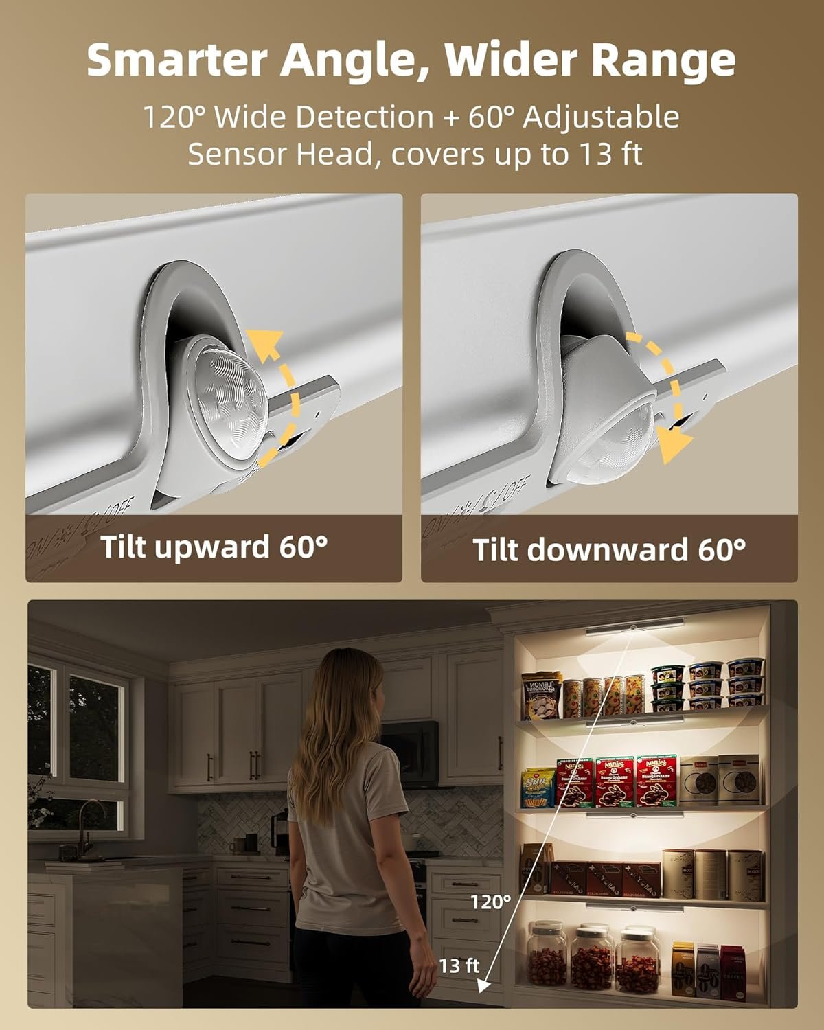 Upgraded Motion Sensor & 3 Modes: With a 60° rotatable sensor head and 120° detection angle, this closet lighting covers up to 13 ft of auto-on range. Aim detection where you need it—toward the closet entrance, down for kids, or up for high shelves. Supports 3 modes: Always On Mode continuous, All-Day Motion Mode motion in any light, and Night Motion Mode only in darkness. Shuts off after 20s to save energy—no more fumbling for switches at night. NOTE: Slide the side switch to ON to activate the light.