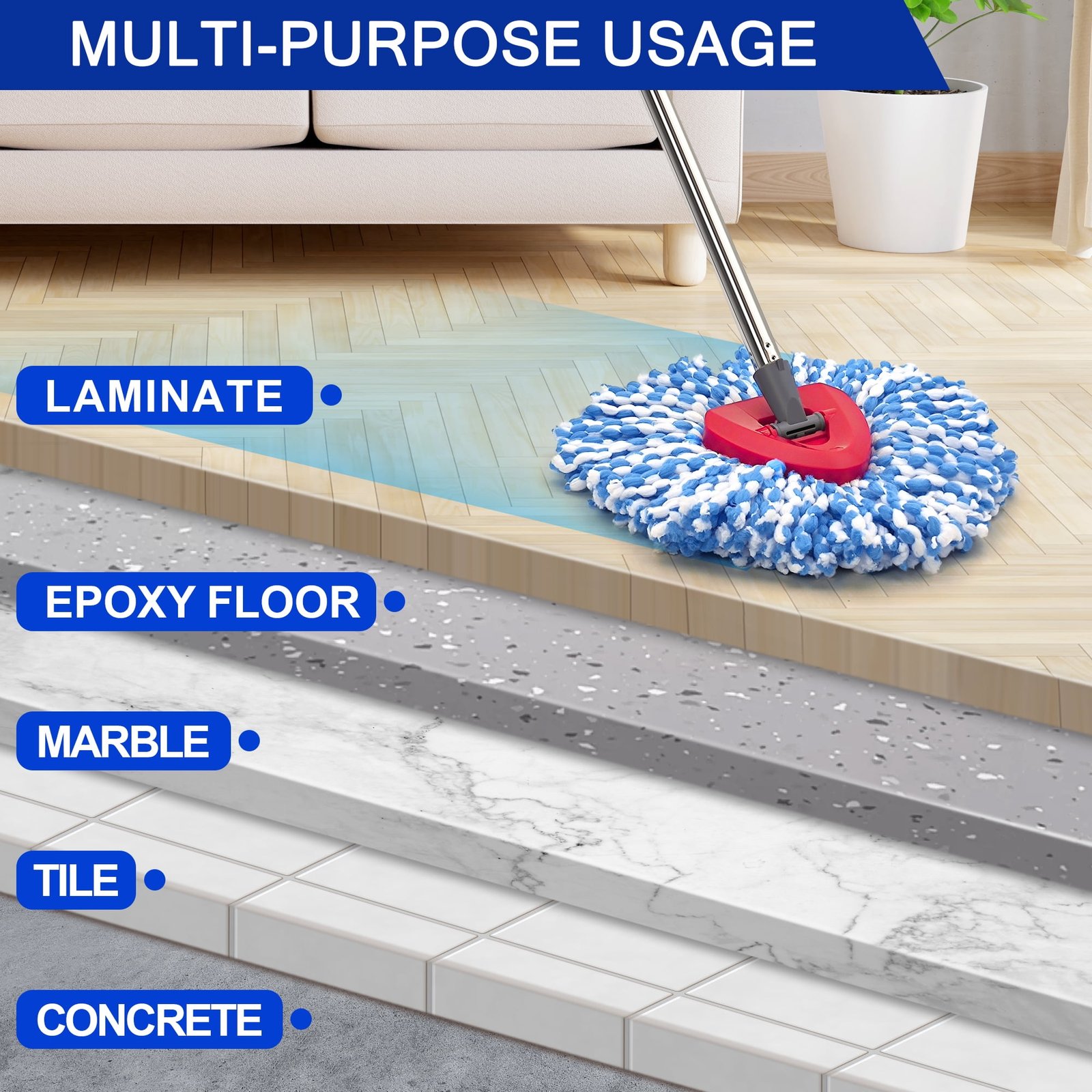 The microfiber mop heads are highly absorbent and effective at removing dust, dirt, and stains from all floor types including tile, hardwood, laminate, and marble. The triangle base design allows for better corner cleaning, while the long handle reduces bending and makes cleaning more comfortable.