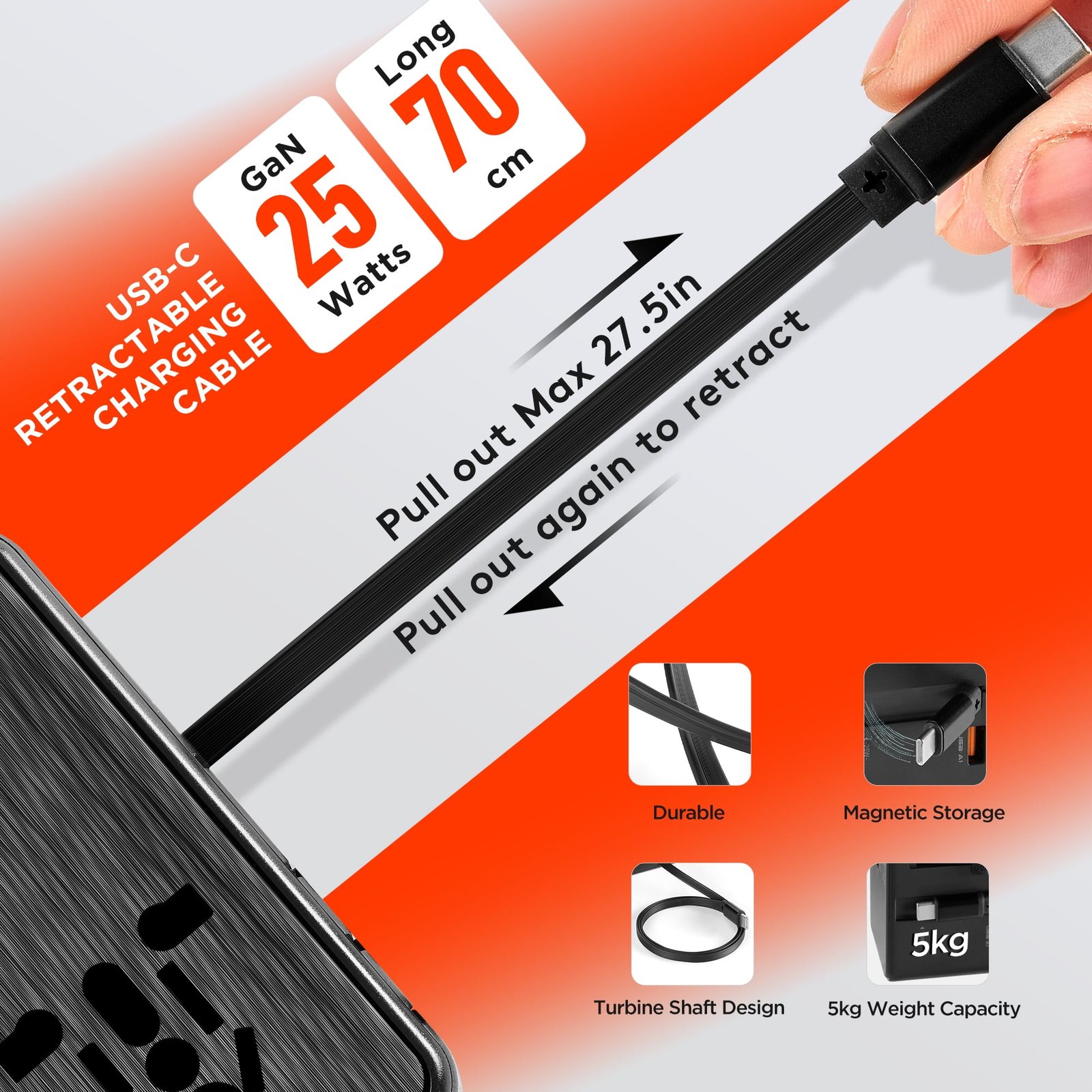 The retractable cable design ensures a clutter-free experience. This adapter supports US, UK, EU, and AU outletsType A, Type C, Type G, Type I, making it a truly global solution.