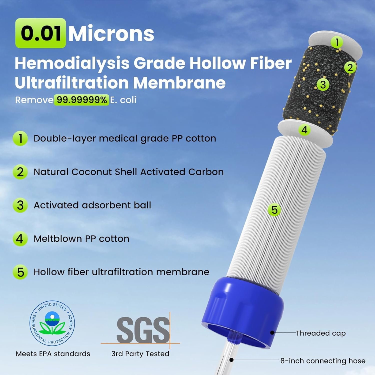 - 5 STAGE FILTER: The outdoor personal water purifier’s 5-stage filtration system, including hollow fiber ultrafiltration membrane, coconut shell activated carbon, mesh plugs, and double-layer medical-grade PP cotton fibers, filters out up to 99.9999% of environmentally unfriendly water, odors, residual chlorine, organic matter, and other microscopic substances Note: TDS value cannot be reduced to ensure that the essential mineral balance of the water is not affected.