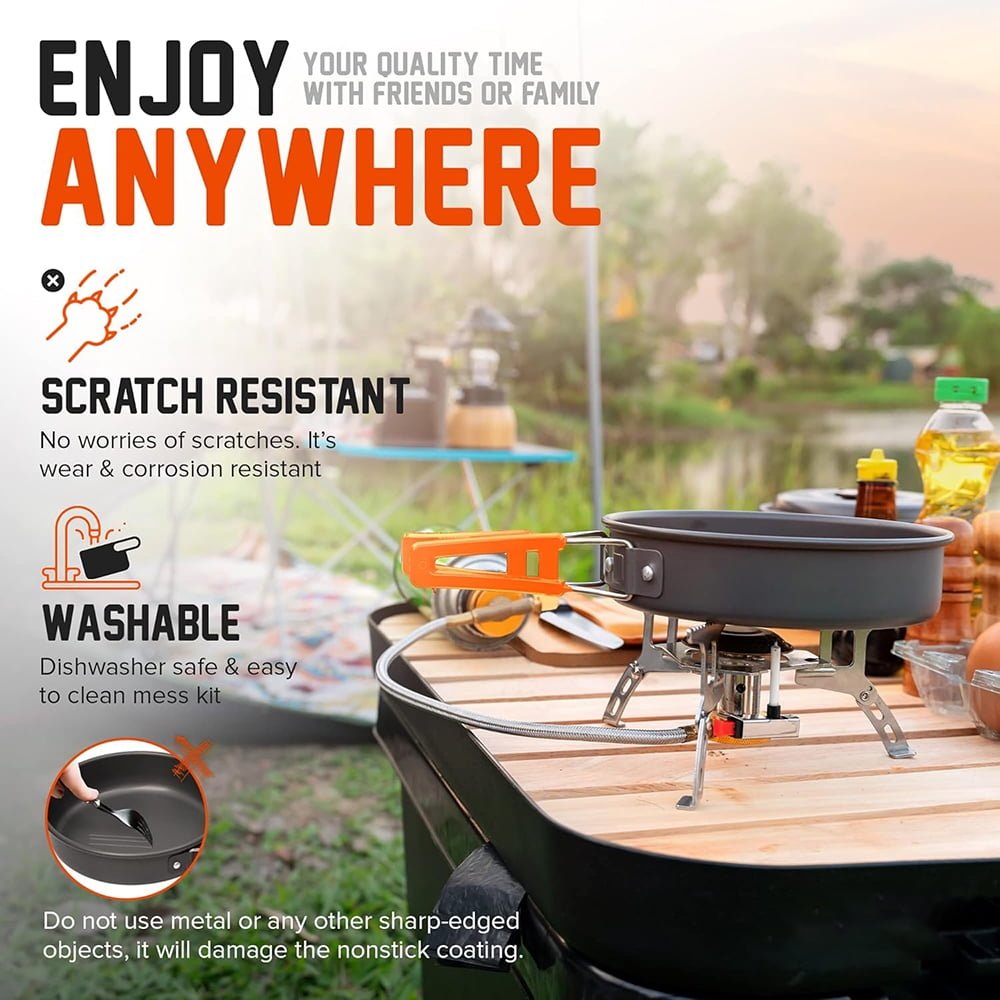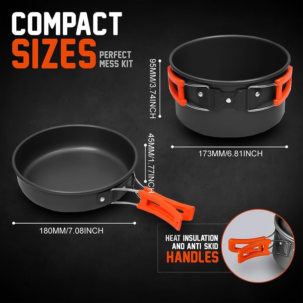 - High-Quality & Safe Materials: Crafted from hard anodized aluminum, this camping cooking set ensures even heat distribution and is easy to clean.The insulated plastic handles prevent burns and the non-slip design ensures safe and comfortable use.Lightweight and built for reliability, it’s the perfect companion for your outdoor adventures.