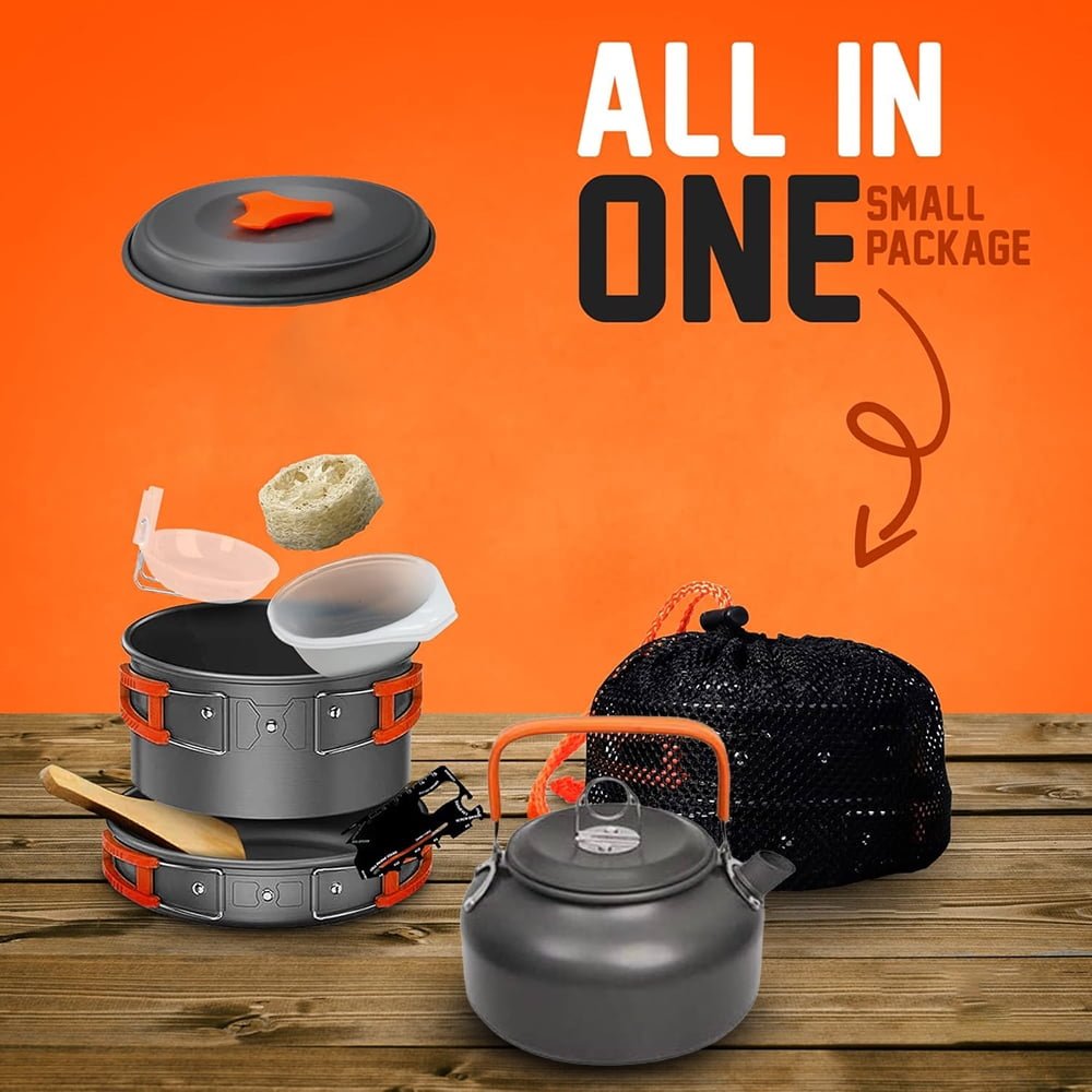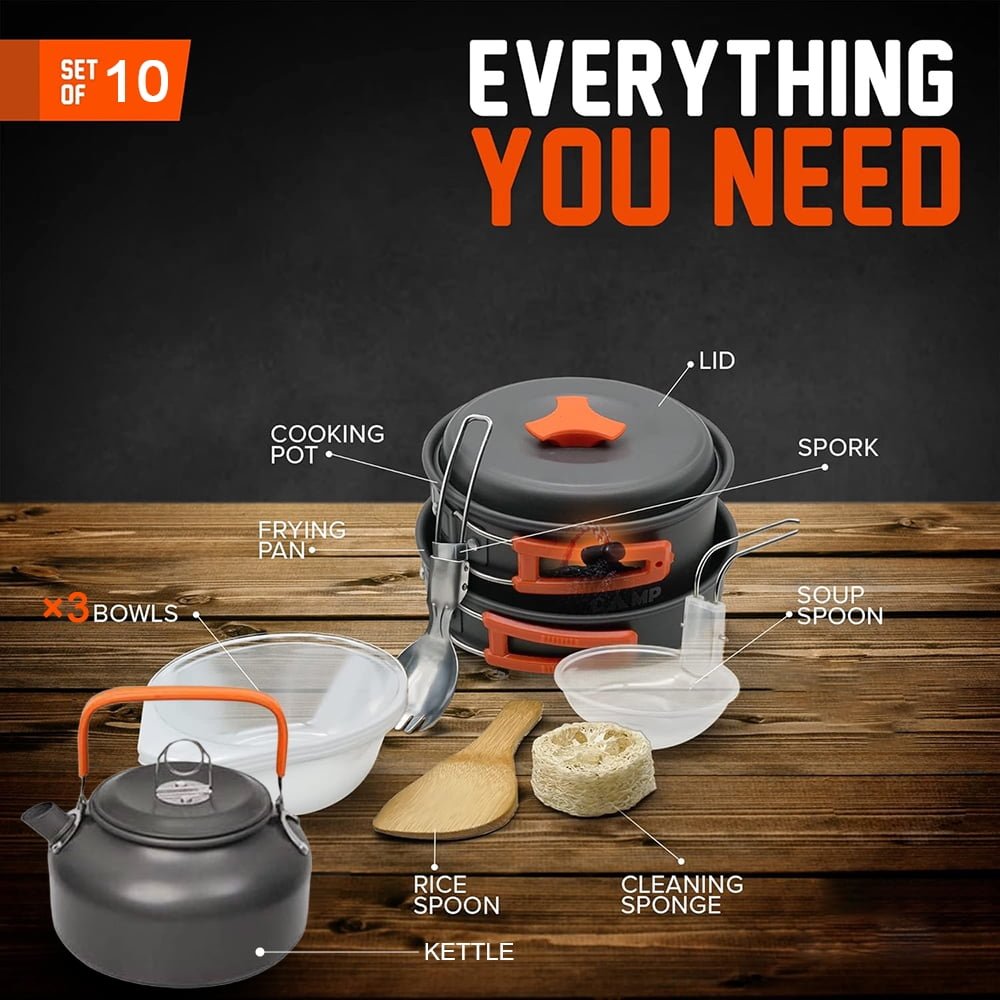 - Complete Camping Cooking Set: This all-in-one camping cookware set has everything you need for outdoor cooking. It includes: 1 x Large Saucepan, 1 x Frying Pan, 1 x Kettle, 3 x Bowls, 1 x Soup Spoon, 1 x Wooden Spoon/Spatula, 1 x Cleaning Sponge, 1 x Storage Bag.